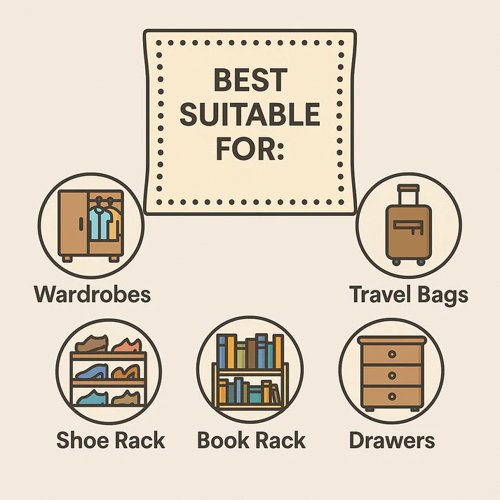 - Place it in your wardrobe, drawer, suitcase, car, or shoe rack.